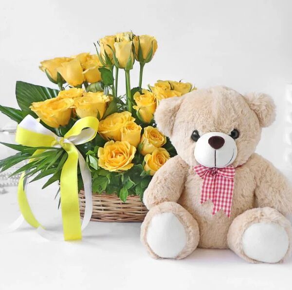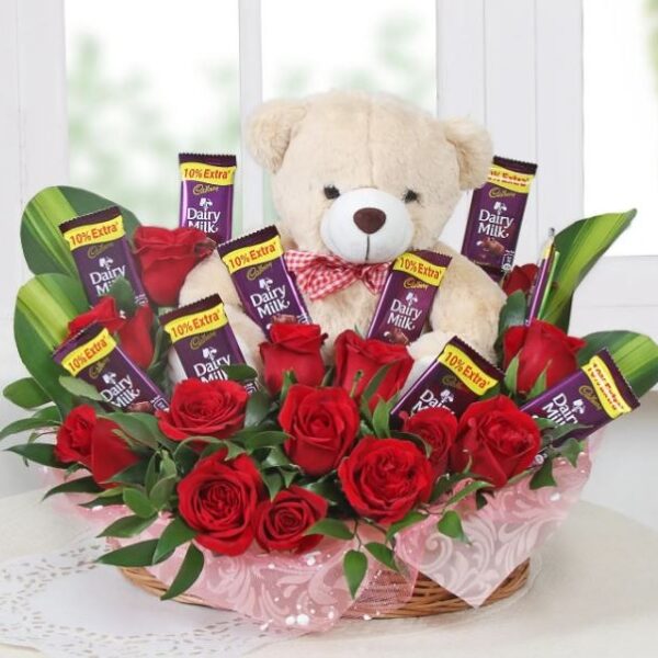 This Beautiful Combination of Flowers and Teddy consists of 5 Fresh Pink Carnations 5 Fresh Red Carnations 5 Fresh White Carnations Nicely wrapped in White paper and Red ribbon bow 6 inch White Teddy Note: While we always strive